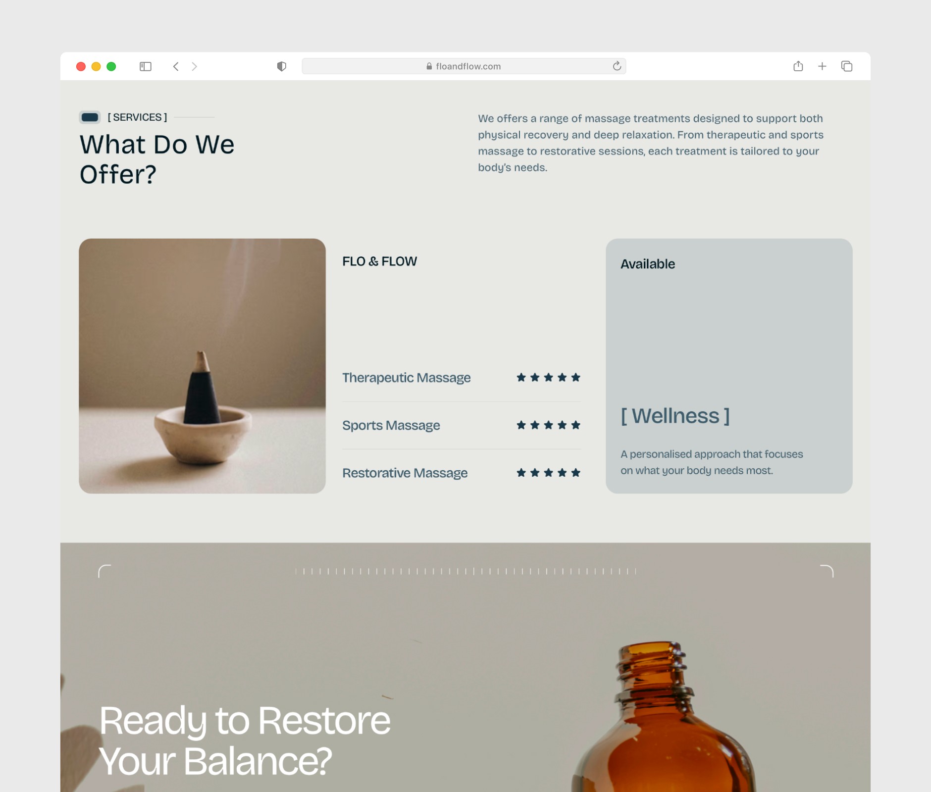 Flo & Flow is a therapeutic and sports massage practice focused on helping clients restore balance, relieve tension, and support physical recovery. The goal of this project was to develop a calm and contemporary brand identity that reflects the practice’s philosophy of balance and flow. The identity was designed to communicate the services clearly, establish trust, and create a welcoming visual presence that supports both the digital experience and client engagement.